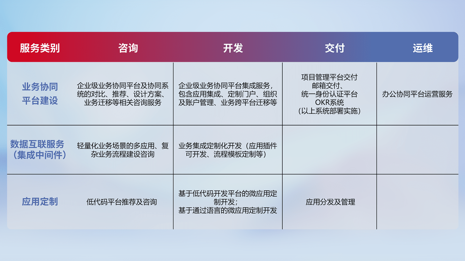 针对钉钉、、企微、、、IDaas等平台级产品提供产品的规划、、方案、、、交付、、、定制化开发等服务,,,,实现如统一协同办公、、、智能客户服务、、混合会议管理、、、智能数据查询、、等业务场景,,,,实现数字化转型。。。。