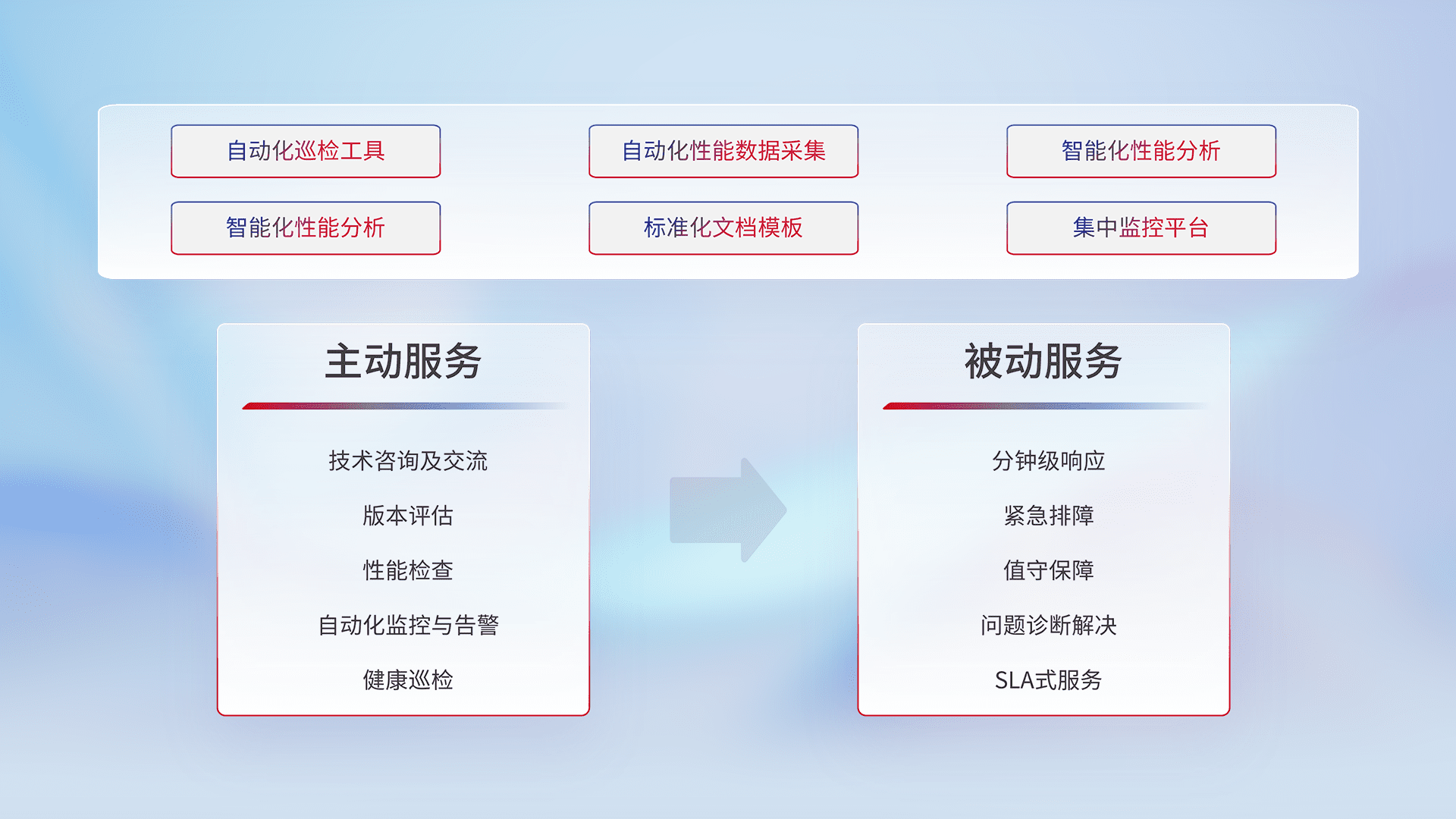 智能化工具和标准化文档,,,保障服务质量,,,提供主动服务(包含技术咨询、、版本评估、、、、性能检查、、自动化监控与告警、、、、健康巡检)和被动服务包含(分钟级响应、、紧急排障、、、、值守保障、、、问题诊断解决、、SLA服务)。。